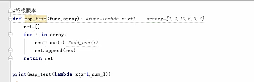 传匿名函数: print(list(map(lambda x:x**2,[1,2,3,4]))) 传有名函数: def weita(x): return x+1 print(list(map(weita,[7,8,9,10])))