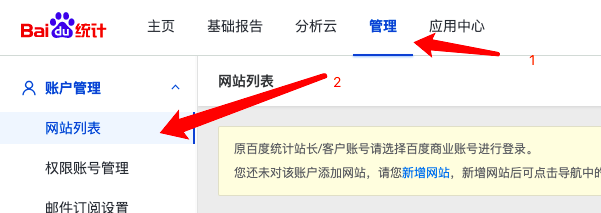 1. 打开百度统计网站,并依次进入下面页面:管理》网站列表