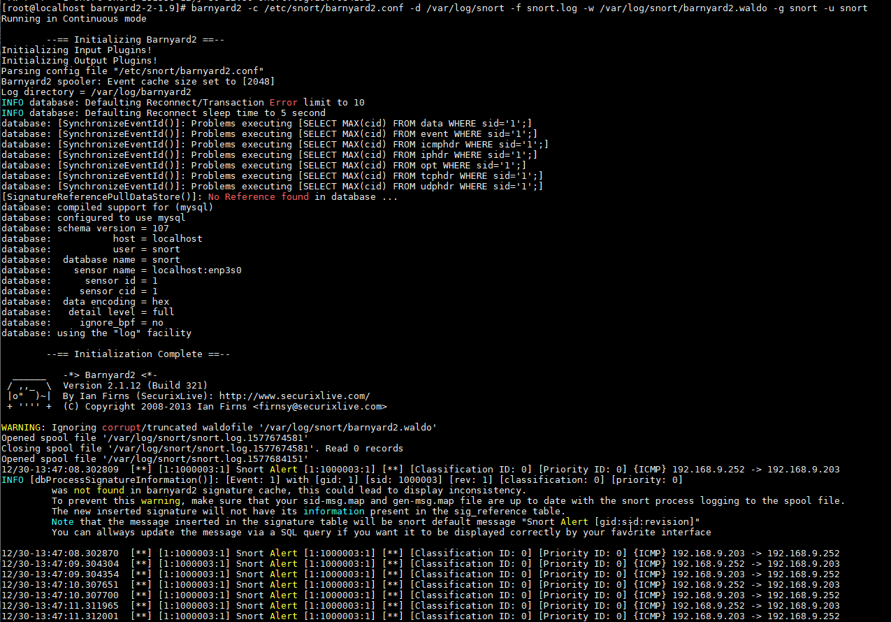 barnyard2 -c /etc/snort/barnyard2.conf -d /var/log/snort -f snort.log -w /var/log/snort/barnyard2.waldo -g snort -u snort