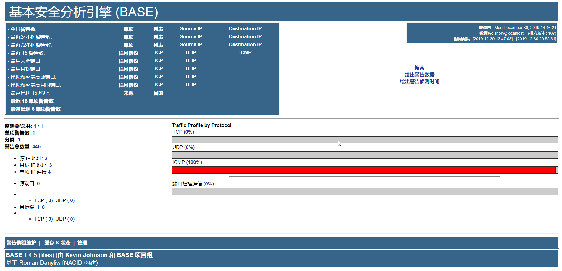 用ping命令进行测试的目的是为了产生报警。ping命令使用ICMP协议,在IDS中使用Libpcap函数所捕获的也是ICMP数据包。下面在Snort主机上操作: