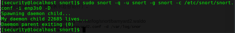 snort -q -u snort -g snort -c /etc/snort/snort.conf -i enp3s0 –D