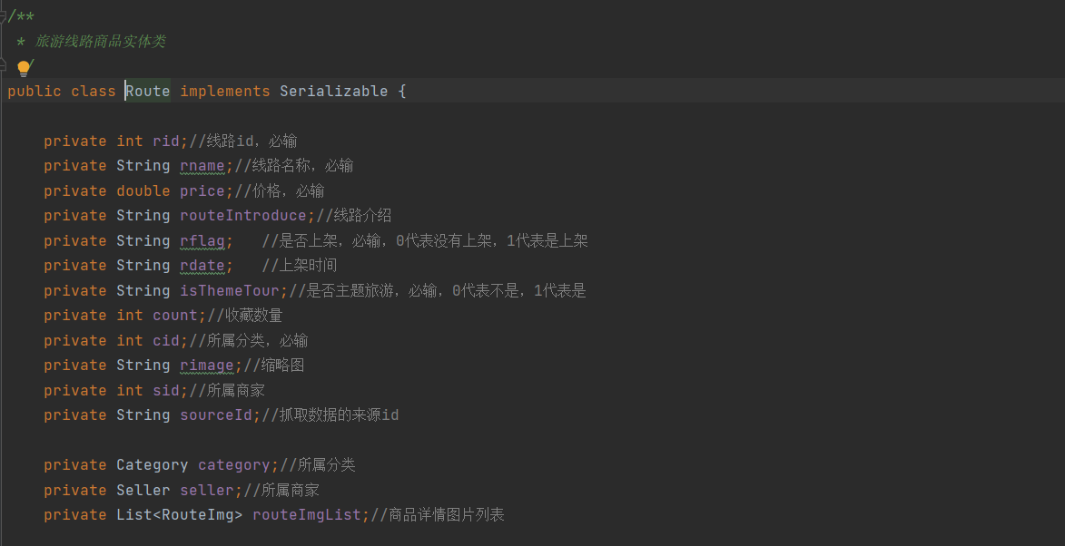 具体信息写在Route类中,同时对应数据库中的三张表:tab_route、tab_route_img、tab_seller。