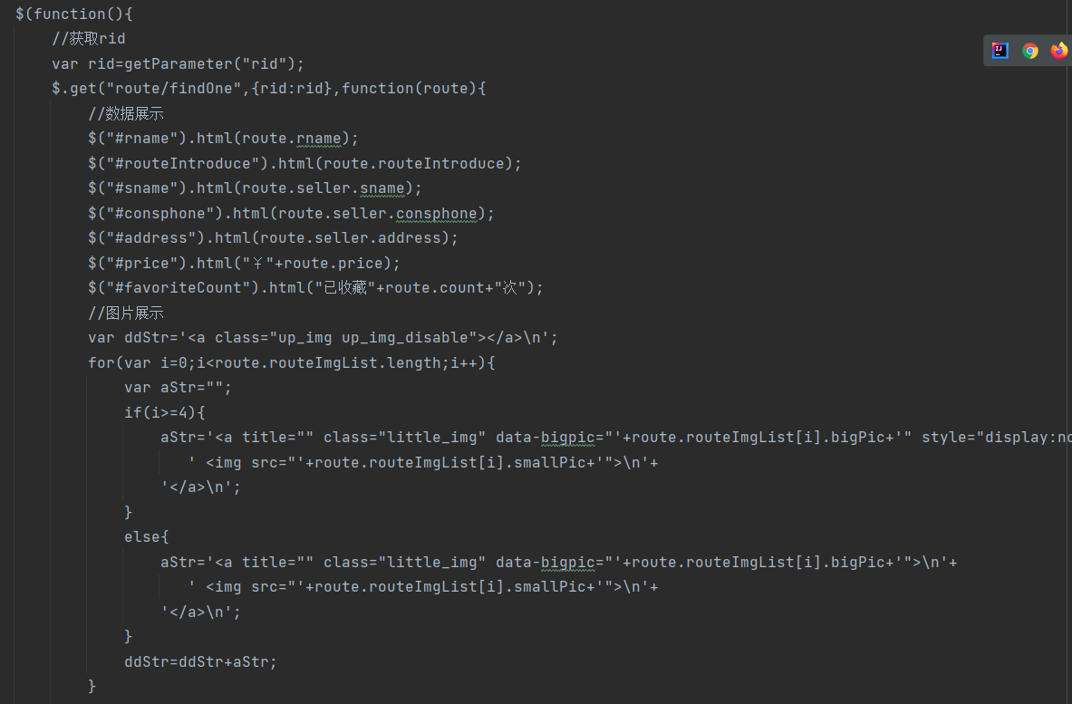 由于对应数据库中的三张表,因此需要对数据库进项三次查询,分别查询一条线路的具体信息,一条线路的图片合集、一条线路的卖家信息。