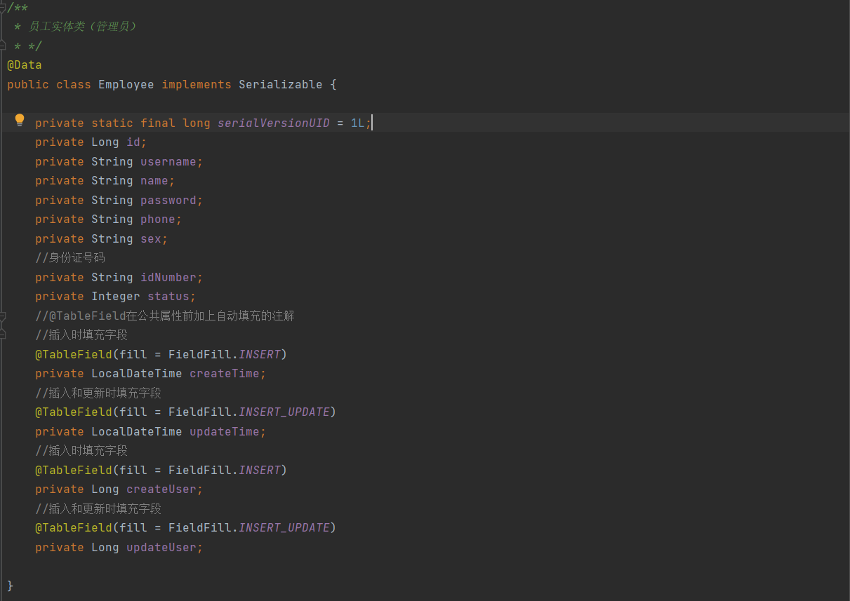 对于公共字段的自动填充,需要在实体类中需要自动填充的变量上添加@TableField注解。