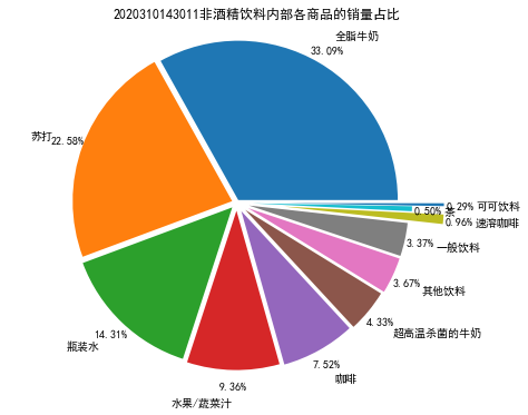 plt.title("2020310143011非酒精饮料内部各商品的销量占比") # 设置标题