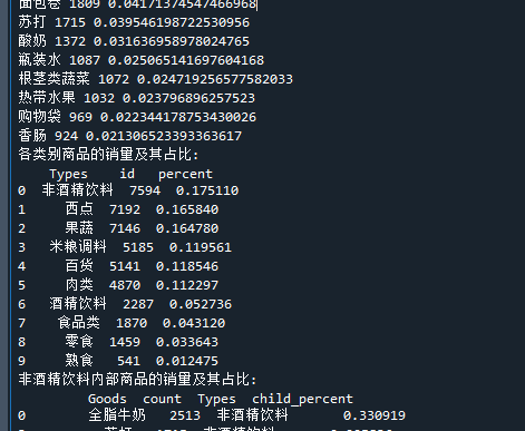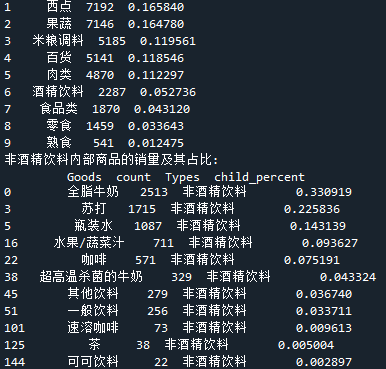 print('非酒精饮料内部商品的销量及其占比:\n',selected)