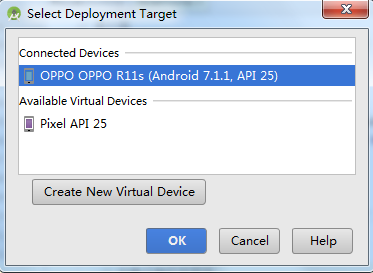 2、在Android Studio上点击绿色运行按钮,选择自己的设备,点击OK: