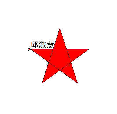 from turtle import * fillcolor("red") begin_fill() import turtle turtle.write("邱淑慧", move=False, align="left", font=("Arial", 20, "normal")) while True: forward(200) right(144) if abs(pos()) < 1: break end_fill()