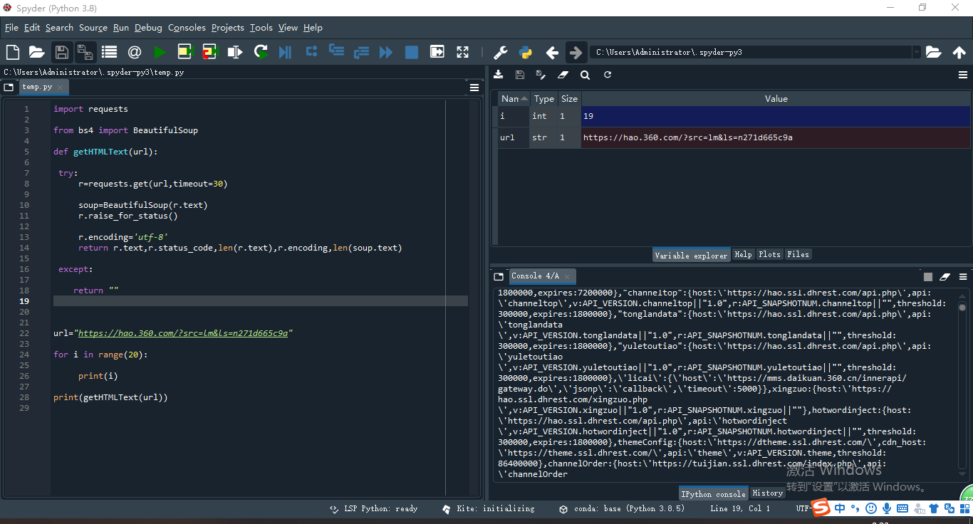 import requests from bs4 import BeautifulSoup def getHTMLText(url): try: r=requests.get(url,timeout=30) soup=BeautifulSoup(r.text) r.raise_for_status() r.encoding='utf-8' return r.text,r.status_code,len(r.text),r.encoding,len(soup.text) except: return "" url="https://hao.360.com/?src=lm&ls=n271d665c9a" for i in range(20): print(i) print(getHTMLText(url))
