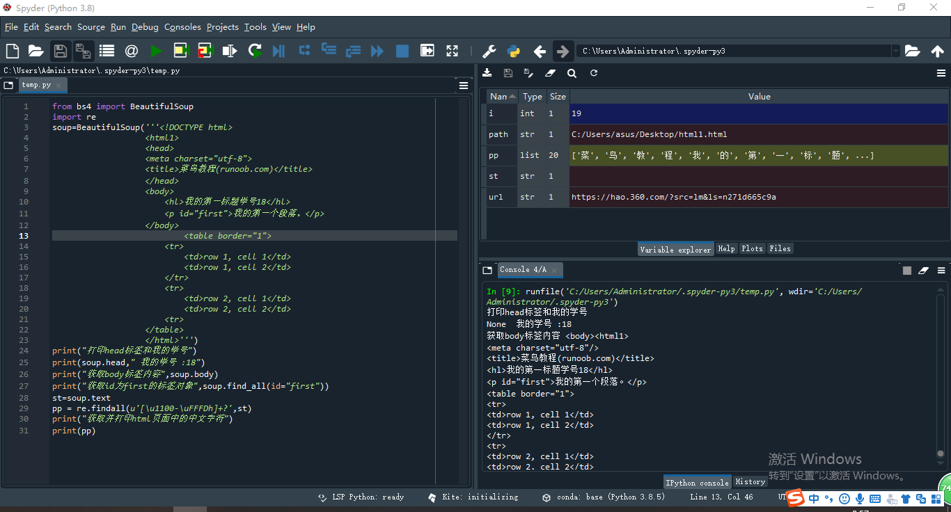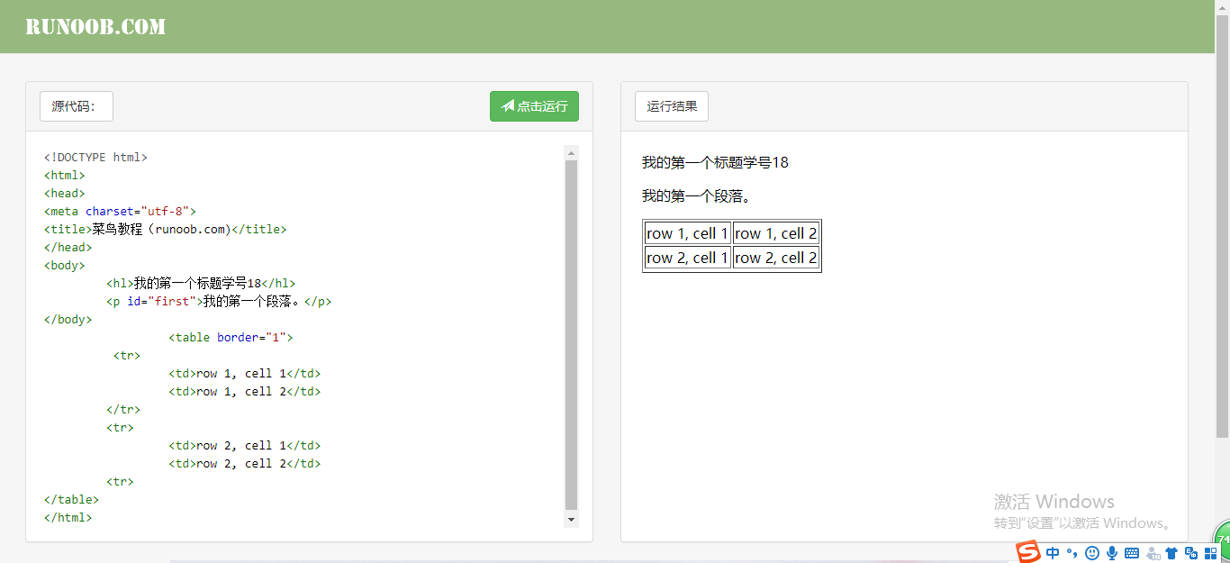 from bs4 import BeautifulSoup import re soup=BeautifulSoup('''<!DOCTYPE html> <html1> <head> <meta charset="utf-8"> <title>菜鸟教程(runoob.com)</title> </head> <body> <hl>我的第一标题学号18</hl> <p id="first">我的第一个段落。</p> </body> <table border="1"> <tr> <td>row 1, cell 1</td> <td>row 1, cell 2</td> </tr> <tr> <td>row 2, cell 1</td> <td>row 2, cell 2</td> <tr> </table> </html>''') print("打印head标签和我的学号") print(soup.head," 我的学号 :18") print("获取body标签内容",soup.body) print("获取id为first的标签对象",soup.find_all(id="first")) st=soup.text pp = re.findall(u'[\u1100-\uFFFDh]+?',st) print("获取并打印html页面中的中文字符") print(pp)