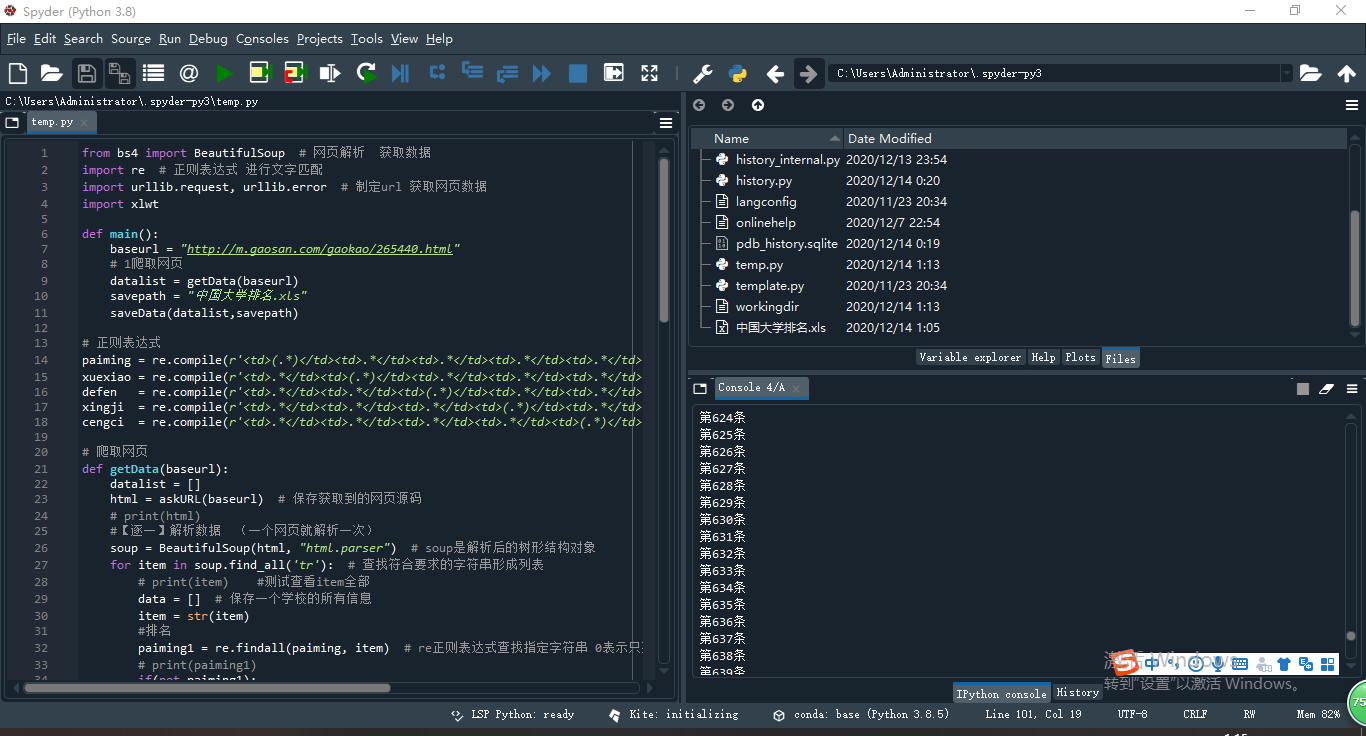 from bs4 import BeautifulSoup # 网页解析 获取数据 import re # 正则表达式 进行文字匹配 import urllib.request, urllib.error # 制定url 获取网页数据 import xlwt def main(): baseurl = "http://m.gaosan.com/gaokao/265440.html" # 1爬取网页 datalist = getData(baseurl) savepath = "中国大学排名.xls" saveData(datalist,savepath) # 正则表达式 paiming = re.compile(r'<td>(.*)</td><td>.*</td><td>.*</td><td>.*</td><td>.*</td>') # 创建超链接正则表达式对象,表示字符串模式,规则 xuexiao = re.compile(r'<td>.*</td><td>(.*)</td><td>.*</td><td>.*</td><td>.*</td>') defen = re.compile(r'<td>.*</td><td>.*</td><td>(.*)</td><td>.*</td><td>.*</td>') xingji = re.compile(r'<td>.*</td><td>.*</td><td>.*</td><td>(.*)</td><td>.*</td>') cengci = re.compile(r'<td>.*</td><td>.*</td><td>.*</td><td>.*</td><td>(.*)</td>') # 爬取网页 def getData(baseurl): datalist = [] html = askURL(baseurl) # 保存获取到的网页源码 # print(html) #【逐一】解析数据 (一个网页就解析一次) soup = BeautifulSoup(html, "html.parser") # soup是解析后的树形结构对象 for item in soup.find_all('tr'): # 查找符合要求的字符串形成列表 # print(item) #测试查看item全部 data = [] # 保存一个学校的所有信息 item = str(item) #排名 paiming1 = re.findall(paiming, item) # re正则表达式查找指定字符串 0表示只要第一个 前面是标准后面是找的范围 # print(paiming1) if(not paiming1): pass else: print(paiming1[0]) data.append(paiming1) if(paiming1 in data): #学校名字 xuexiao1 = re.findall(xuexiao, item)[0] # print(xuexiao1) data.append(xuexiao1) #得分 defen1 = re.findall(defen, item)[0] # print(defen1) data.append(defen1) #星级 xingji1 = re.findall(xingji, item)[0] # print(xingji1) data.append(xingji1) #层次 cengci1 = re.findall(cengci, item)[0] # print(cengci1) data.append(cengci1) # print('-'*80) datalist.append(data) # 把处理好的一个学校信息放入datalist中 return datalist # 得到指定一个url网页信息内容 def askURL(url): # 我的初始访问user agent head = { # 模拟浏览器头部信息,向豆瓣服务器发送消息 伪装用的 "User-Agent": "Mozilla/5.0 (Windows NT 10.0; WOW64) AppleWebKit/537.36 (KHTML, like Gecko) Chrome/80.0.3987.116 Safari/537.36" } # 用户代理表示告诉豆瓣服务器我们是什么类型的机器--浏览器 本质是告诉浏览器我们可以接受什么水平的文件内容 request = urllib.request.Request(url, headers=head) # 携带头部信息访问url # 用request对象访问 html = "" try: response = urllib.request.urlopen(request) # 用urlopen传递封装好的request对象 html = response.read().decode("utf-8") # read 读取 可以解码 防治乱码 # print(html) except urllib.error.URLError as e: if hasattr(e, "code"): print(e.code) # 打印错误代码 if hasattr(e, "reason"): print(e.reason) # 打印错误原因 return html # 3保存数据 def saveData(datalist, savepath): book = xlwt.Workbook(encoding="utf-8", style_compression=0) # 创建workbook对象 样式压缩效果 sheet = book.add_sheet('中国大学排名', cell_overwrite_ok=True) # 创建工作表 一个表单 cell覆盖 for i in range(0, 640): print("第%d条" % (i + 1)) data = datalist[i] # print(data) for j in range(0, 5): # 每一行数据保存进去 sheet.write(i , j, data[j]) # 数据 book.save(savepath) # 保存数据表 #主函数 if __name__ == "__main__": # 当程序执行时 # #调用函数 程序执行入口 main() # init_db("movietest.db") print("爬取完毕!")