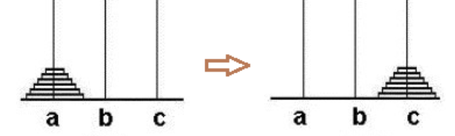 从a柱子移动多个圆盘到b柱子时,必然要通过c柱子来实现。