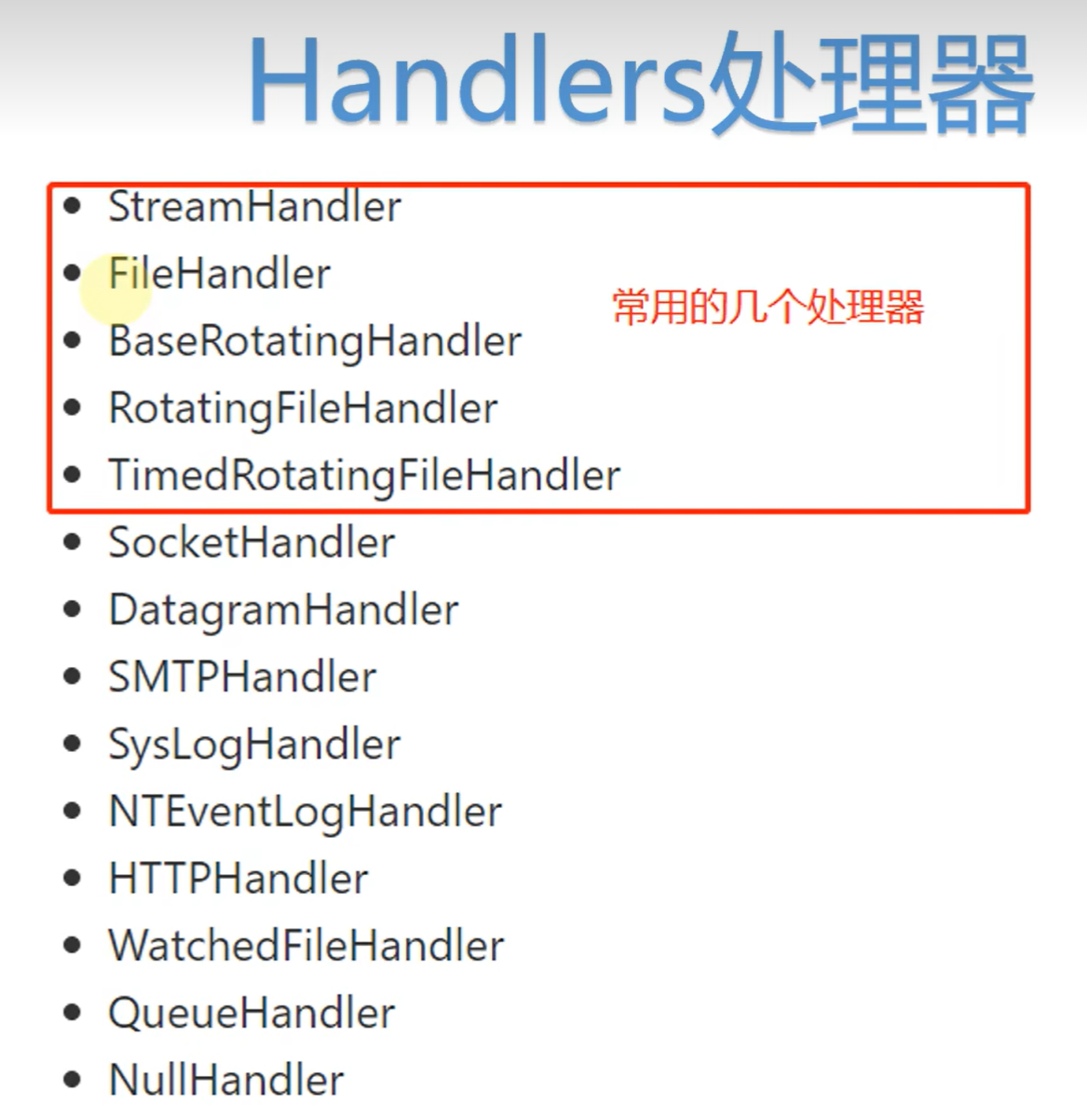 - Handlers:处理器,将记录器产生的日志发送至目的地