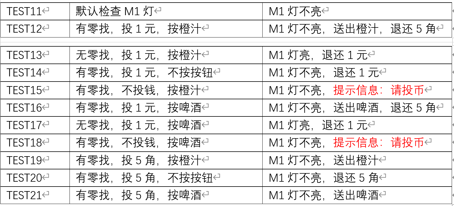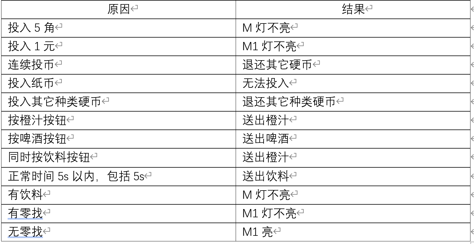 如果售货机没有零钱找,则‘零钱找完’红灯亮,这时在投入1元硬币并按下饮料按钮后,饮料不送出来而且1元硬币也退出来;