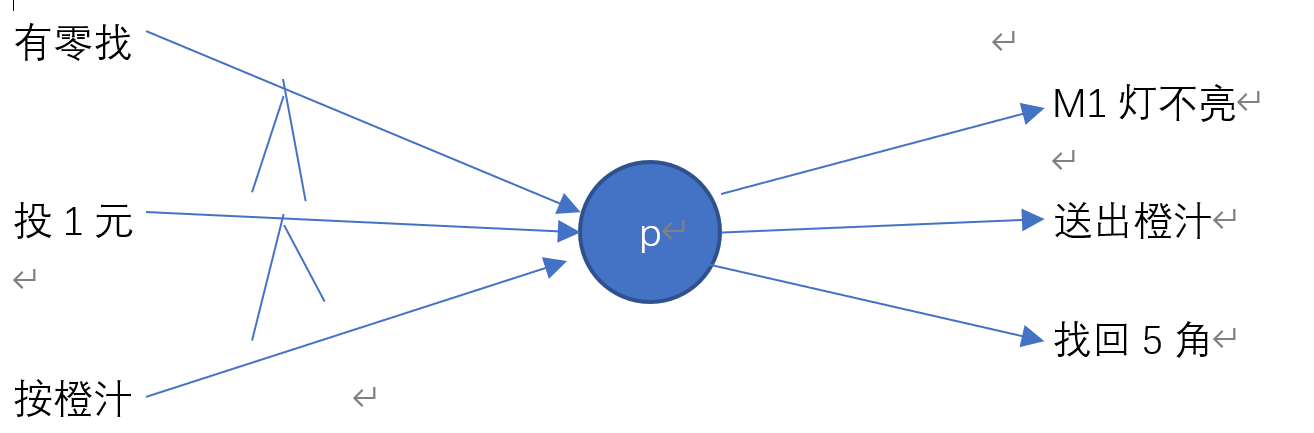 按下‘橙汁’或‘啤酒’按钮(如果同时按按钮系统如何处理?按橙汁和按啤酒是互斥事件,不能同时成立,如果同时按系统只能识别第一个橙汁)