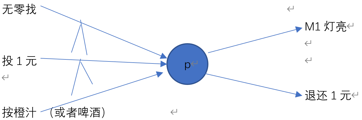 售货机所有饮料的价格都是5角钱,其规格说明如下:若投入5角钱或1元钱的硬币,按下‘橙汁’或‘啤酒’按钮,则相应的饮料就送出来,