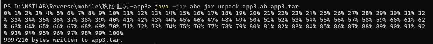 (https://github.com/nelenkov/android-backup-extractor/releases),且要在java环境下运行,把它们全都放在同一文件夹下,运行java -jar abe.jar unpack app3.ab app3.tar