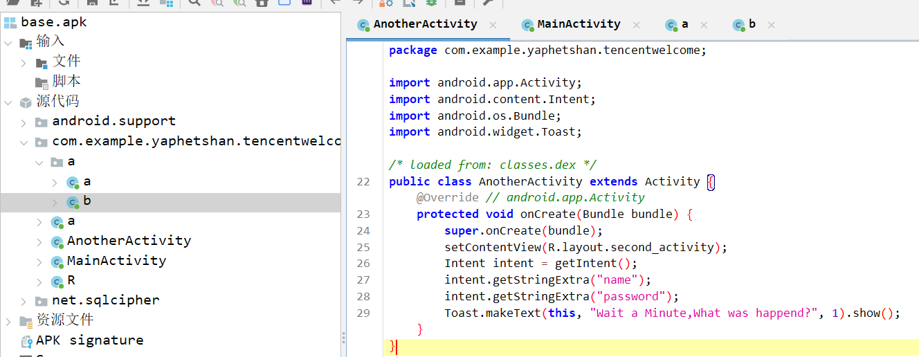 AnotherActivity主要功能是显示一个Toast消息,并没有实际处理从MainActivity