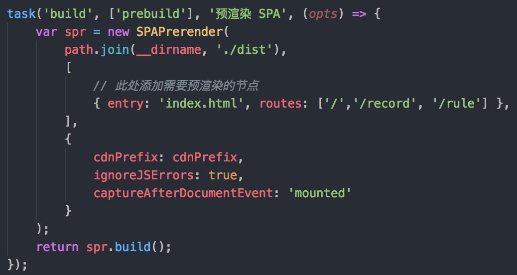 由于 SPA 可以由多个路由构成,需要根据业务场景决定哪些路由需要用到预渲染。因此这里的配置文件主要是用于告知编译器需要进行预渲染的路由。
