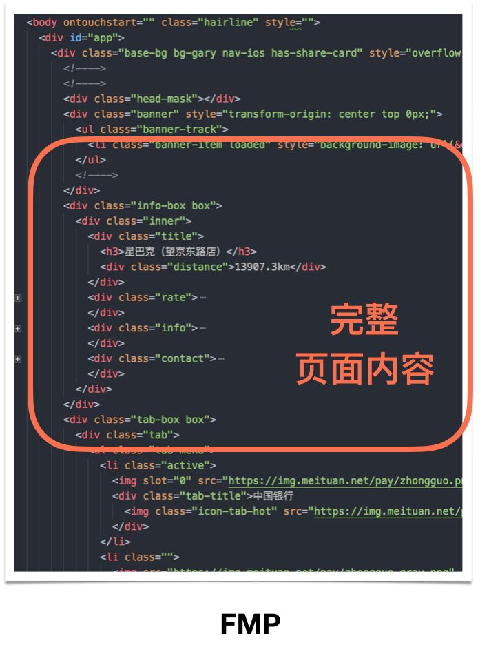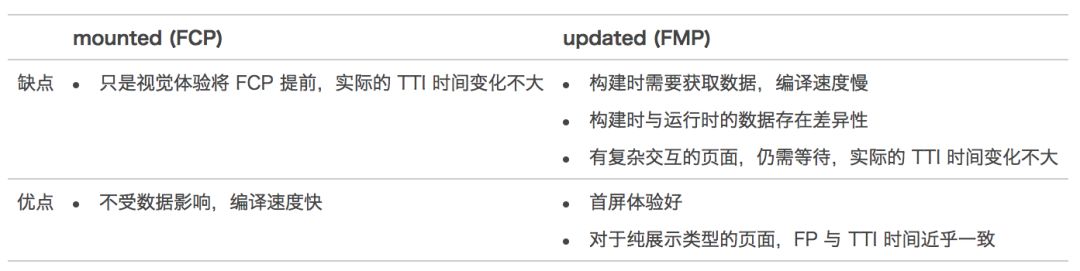 仍然以 Vue 为例, 在其生命周期中,mounted 对应的是 FCP,updated 对应的是 FMP。那么具体应该使用哪个生命周期的 HTML 结构呢?