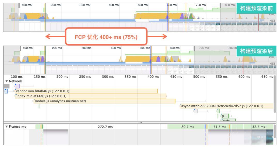 通过构建时预渲染在项目中的使用,FCP 的时间相比之前减少了 75%。