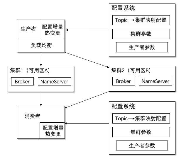 所有的 Topic 默认都分配到两个可用区,生产者和消费者会同时连接至少两个独立集群(分布在不同的可用区),如下图: