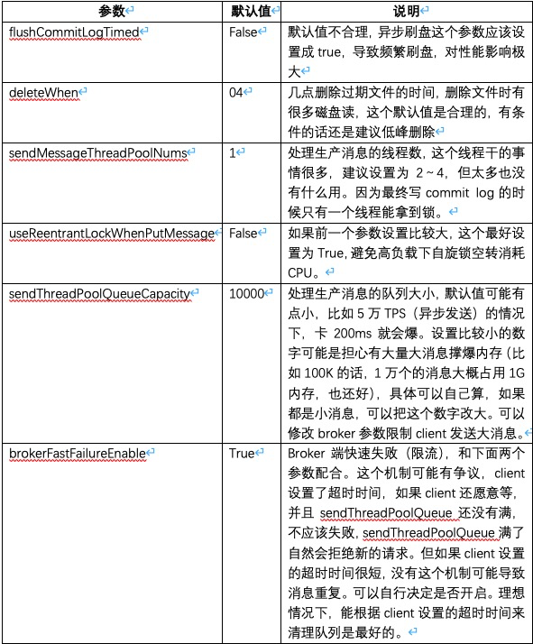 Broker 默认的参数在我们的场景下(SSD、同步复制、异步刷盘)不是最优的,有的参数也许在大多数场景下都不是最优的。我们列出一些重要的参数,供大家参考: