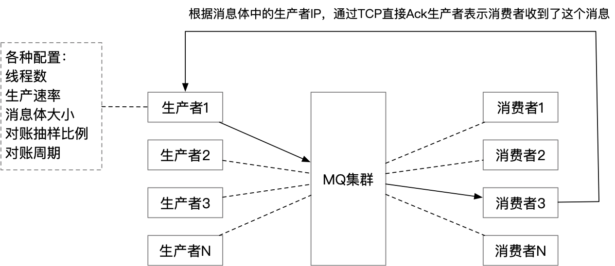 这套机制也可以用于分布式性能压测和故障演练。在做压测的时候,每个消息都 ACK 的话,对生产者的内存压力很大,因为它发出去的消息,需要在内存中保留一段时间(直到到达这个消息的对账时间),这段时间消费者 ACK 或者重复 ACK 都需要记录。所以我们实现了按比例抽样对账的功能,开启以后只有需要对账的消息才会在内存中保留一段时间。
