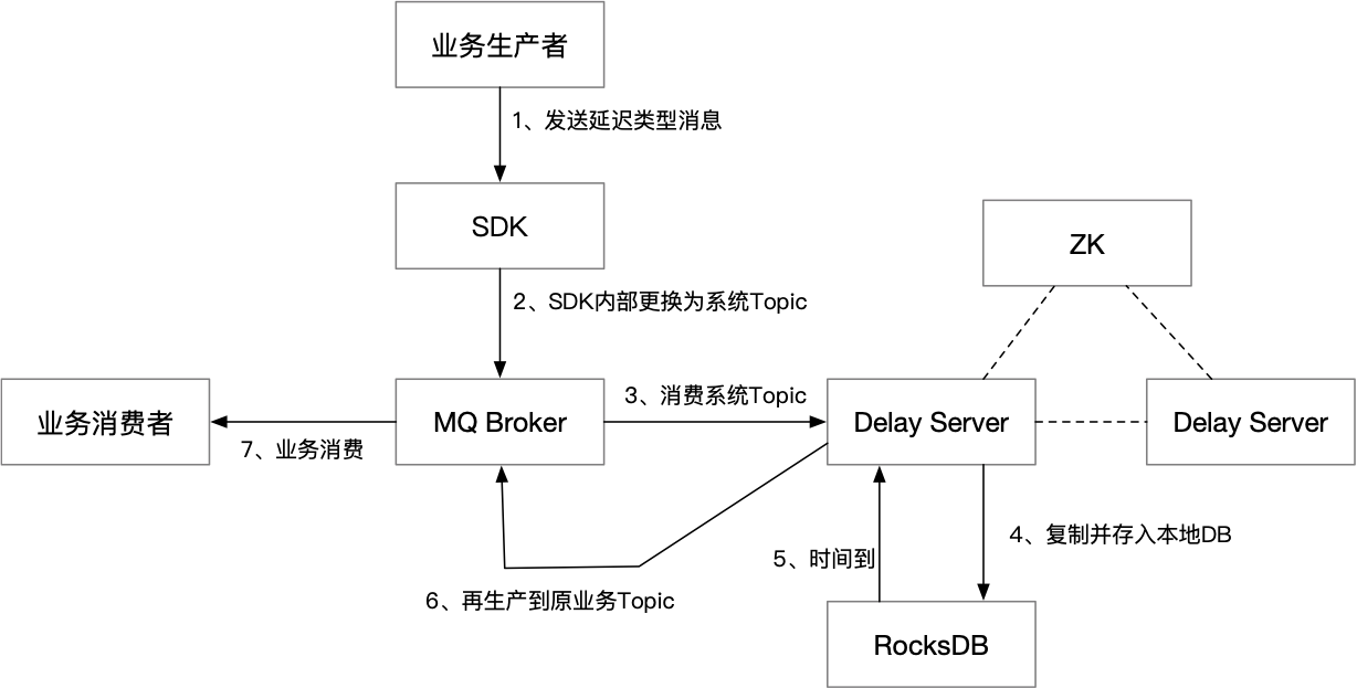 延迟消息是非常重要的业务功能,不过 RocketMQ 内置的延迟消息只能支持几个固定的延迟级别,所以我们又开发了单独的 Delay Server 来调度延迟消息: