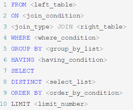 FROM -> WHERE -> GROUP BY -> HAVING -> SELECT 的字段 -> DISTINCT -> ORDER BY -> LIMIT