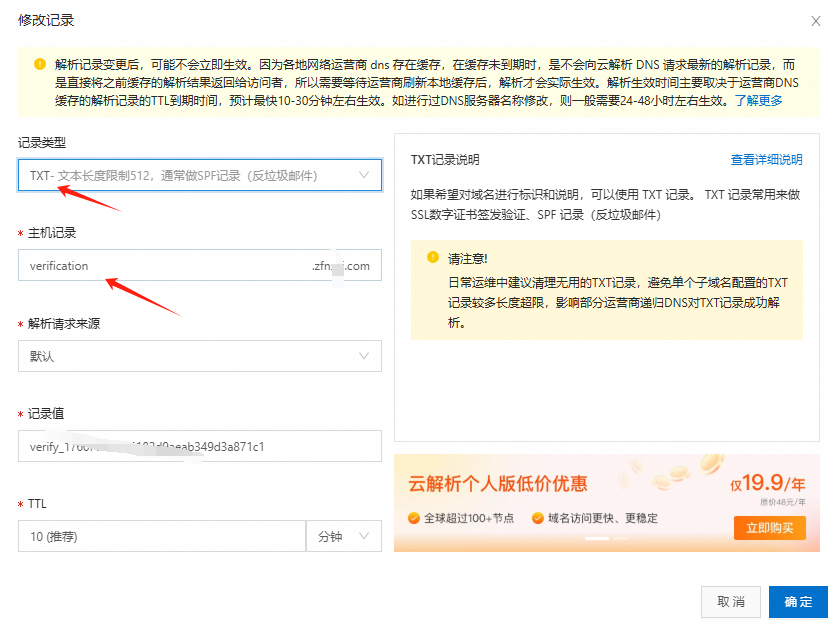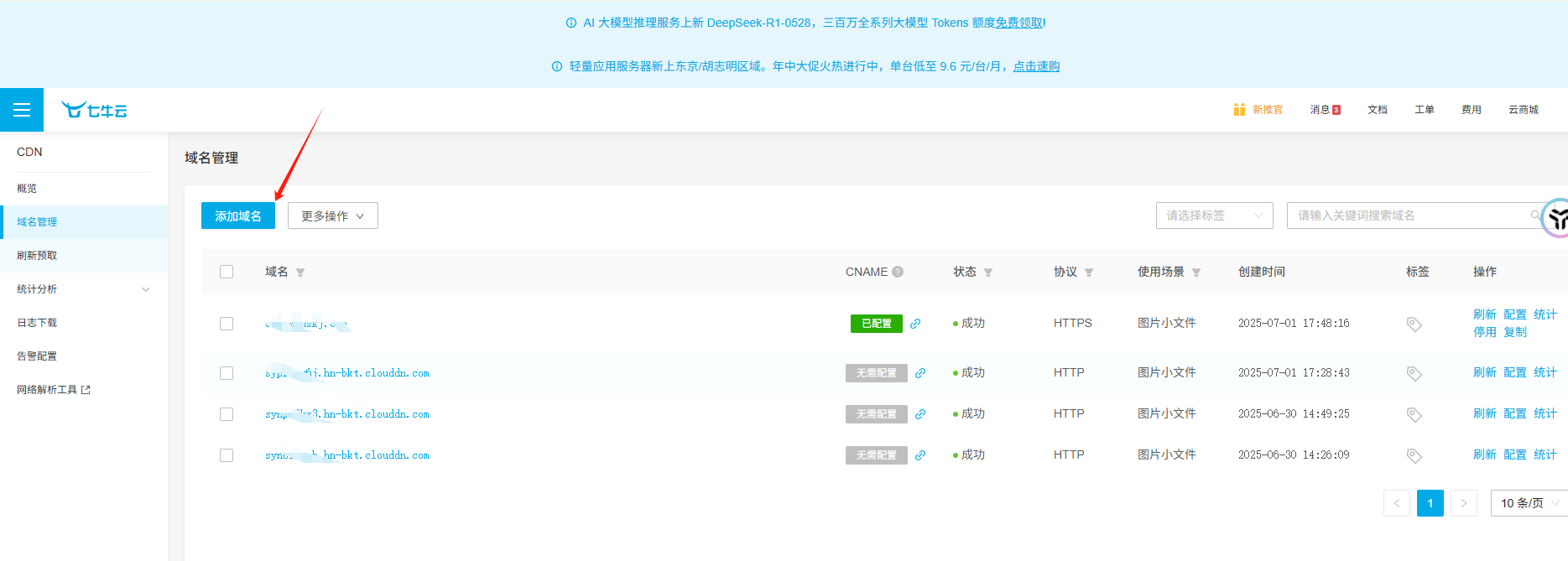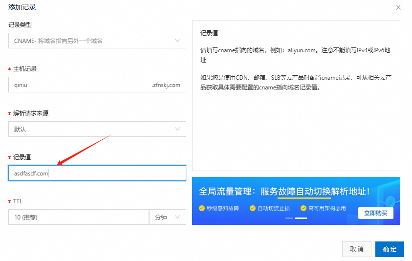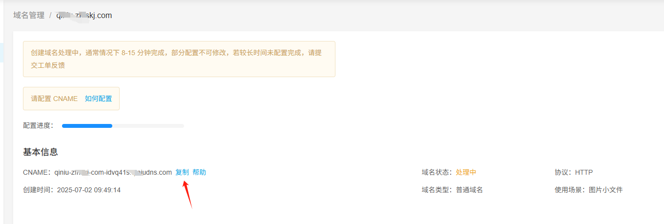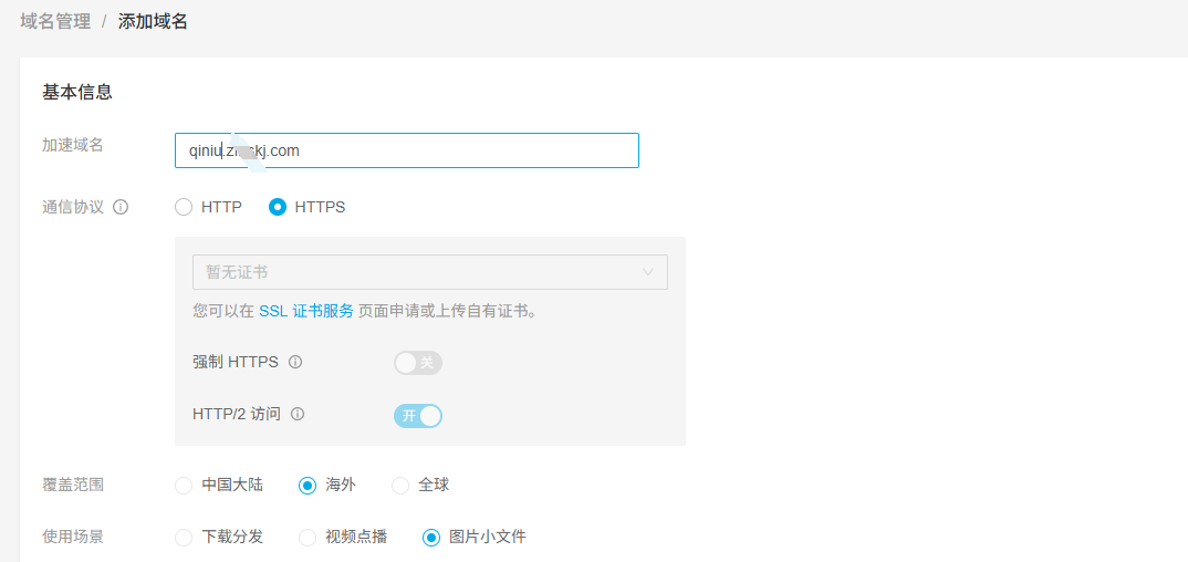 证书的话也可选择阿里,或者选择七牛云上的免费证书,我选择的是阿里的,注意阿里创建免费证书是指向的是刚刚上面填写的加速域名,如果填其他,那上面的这个域名对应不上,则用不了证书