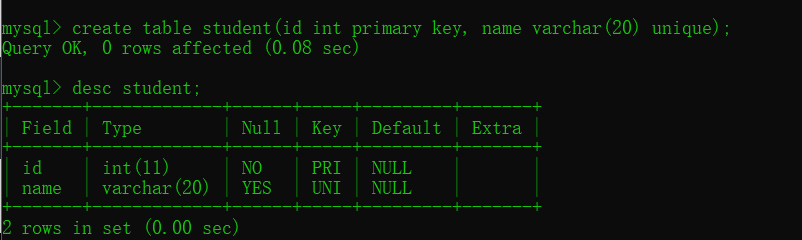 唯一性约束:唯一性约束即UNIQUE用于保证数据表中字段的唯一性,即表中字段的值不能重复出现