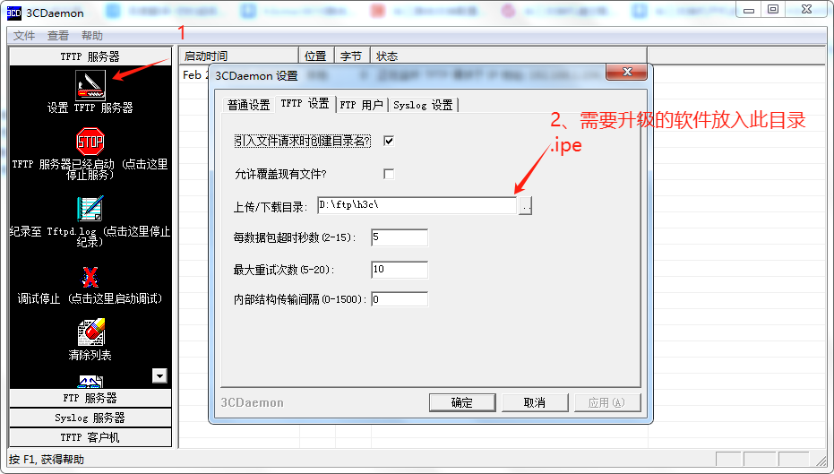 2、在用户 PC(假设 IP 地址为 192.168.0.23)上运行 TFTP Server 程序(3CDaemon软件),以