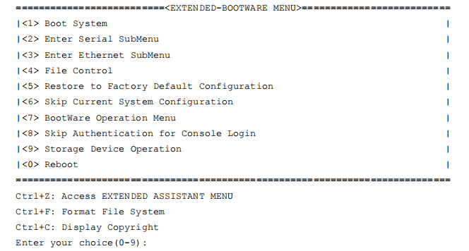 3、在用户 PC 上运行终端仿真程序,启动路由器,键入<Ctrl+B>,进入 BootWare 扩展段主菜单