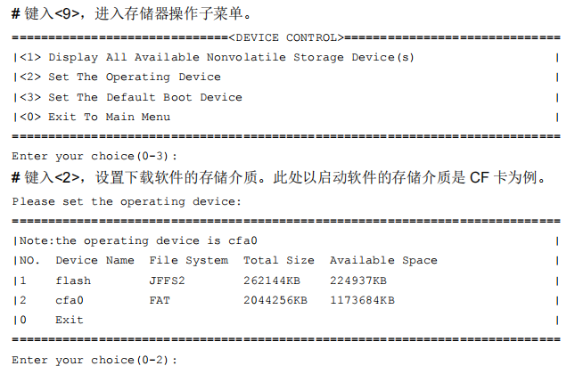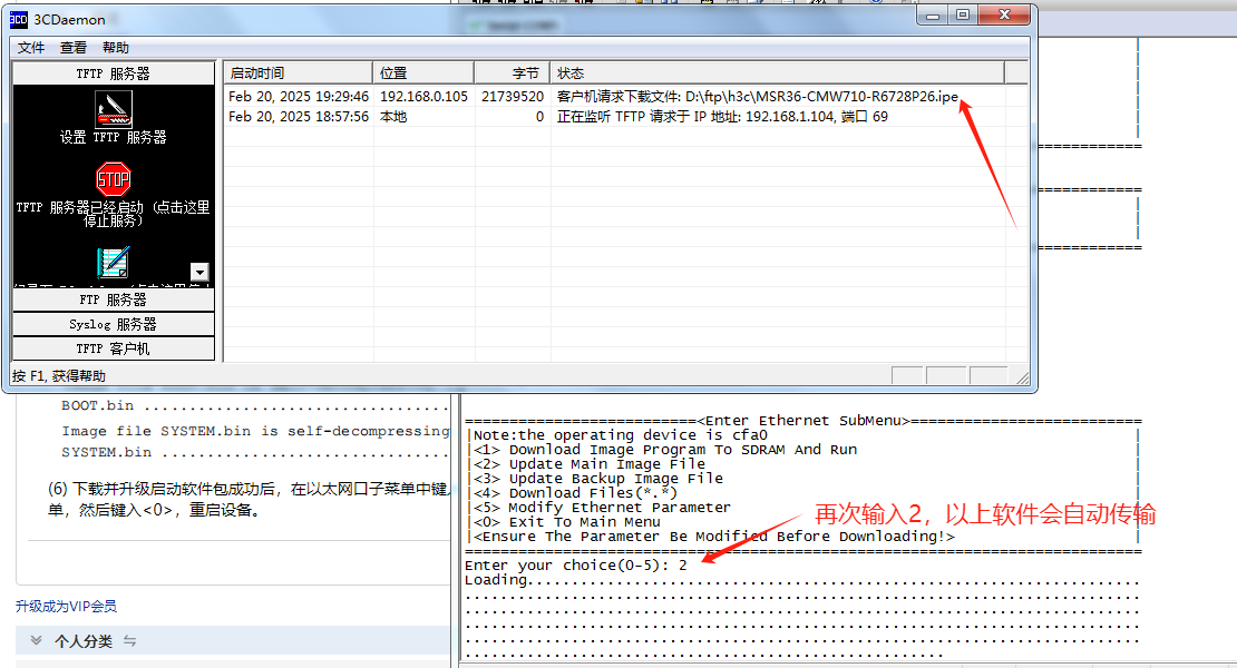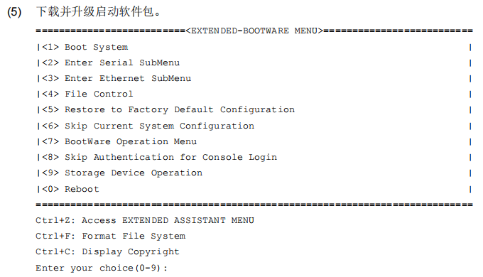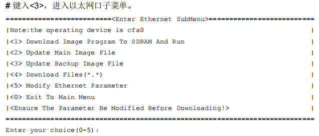 (6) 下载并升级启动软件包成功后,在以太网口子菜单中键入<0>,返回到 BootWare 扩展段主菜