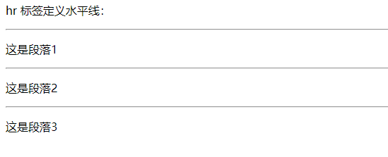 <html> <body> <p>hr 标签定义水平线:</p> <hr /> <p>这是段落1</p> <hr /> <p>这是段落2</p> <hr /> <p>这是段落3</p> </body> </html>