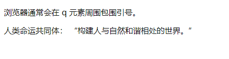 <!DOCTYPE html> <html> <body> <p>浏览器通常会在 q 元素周围包围引号。</p> <p>人类命运共同体: <q>构建人与自然和谐相处的世界。</q></p> </body> </html>