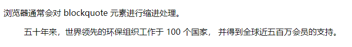 <!DOCTYPE html> <html> <body> <p>浏览器通常会对 blockquote 元素进行缩进处理。</p> <blockquote > 五十年来,世界领先的环保组织工作于 100 个国家, 并得到全球近五百万会员的支持。 </blockquote> </body> </html>