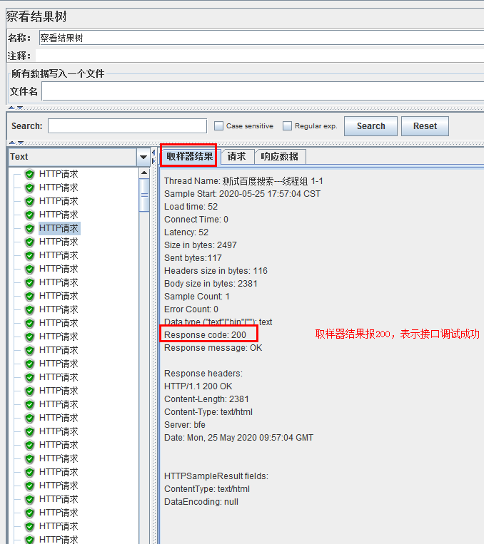 - 取样器结果:返回值报200,表示执行接口调试成功