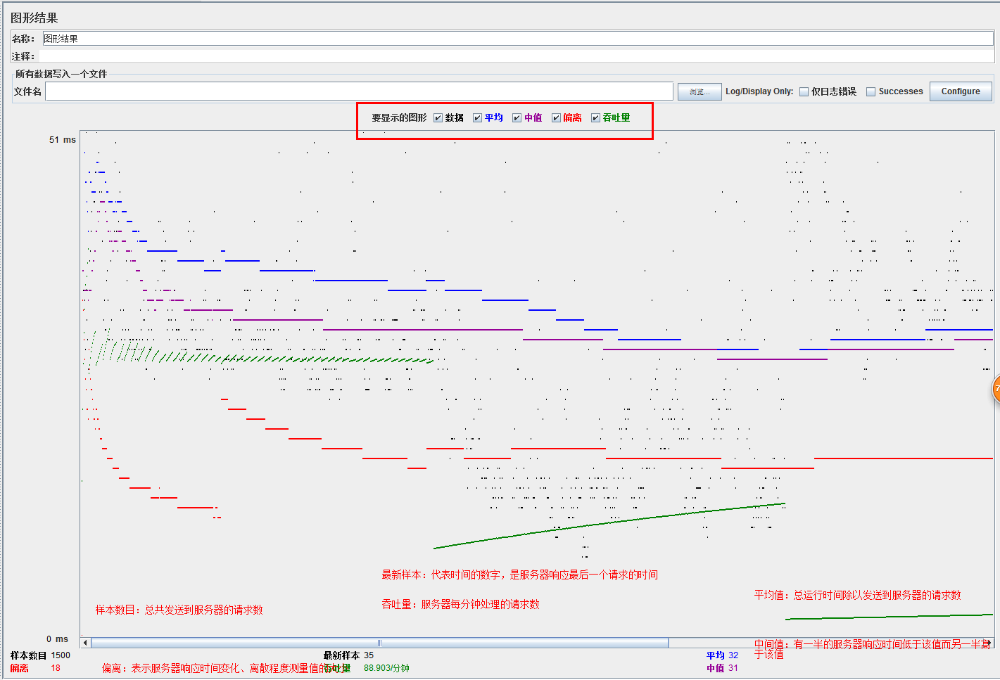Average:单个Request的平均响应时间,计算方法是总运行时间除以发送到服务器的总请求数,对应图形报表中的平均值。