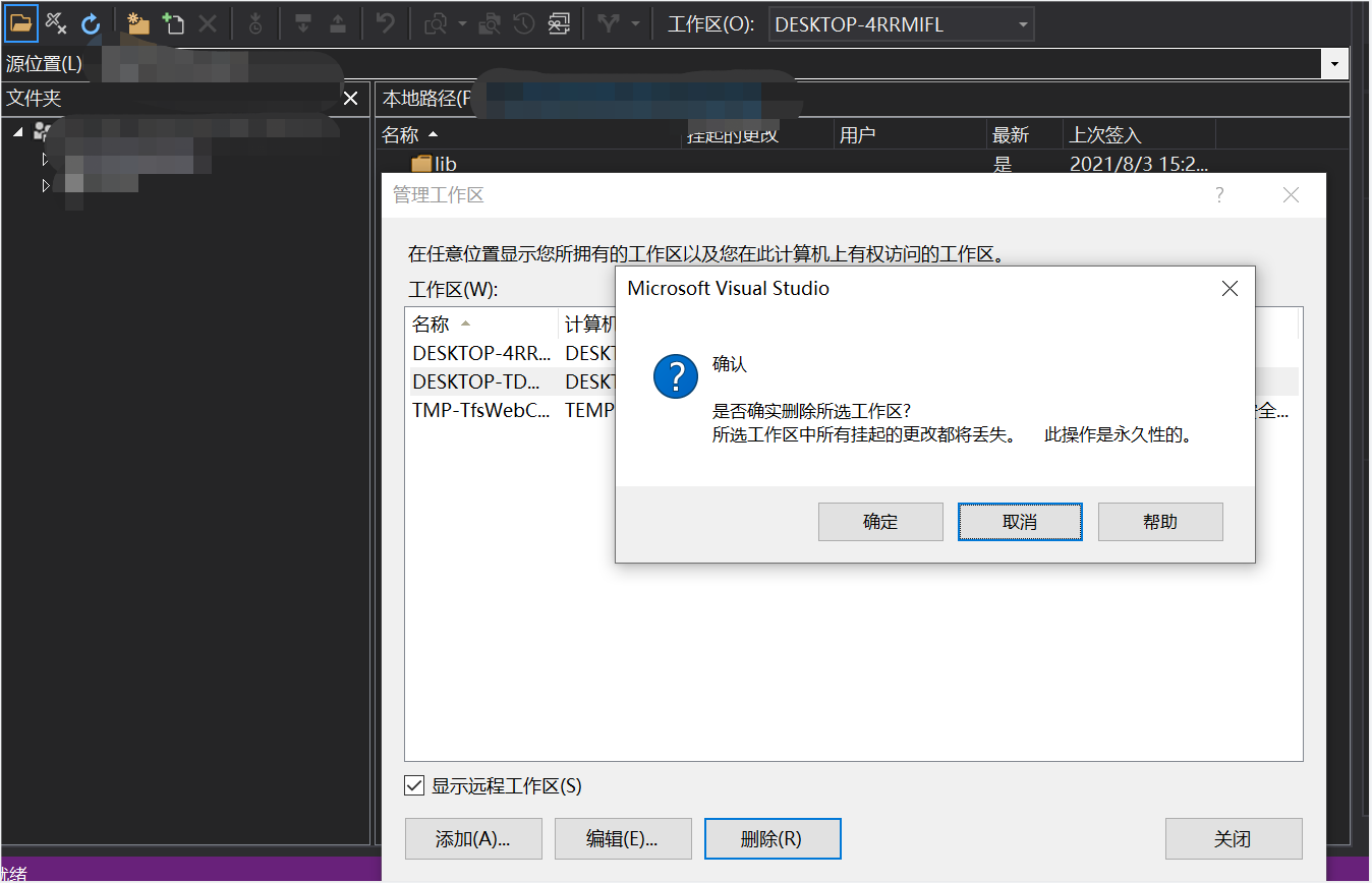 注意: 1、所选工作区删除后该工作区挂起的更改都将丢失。2、该方法只适用于知道原账号并能登录。