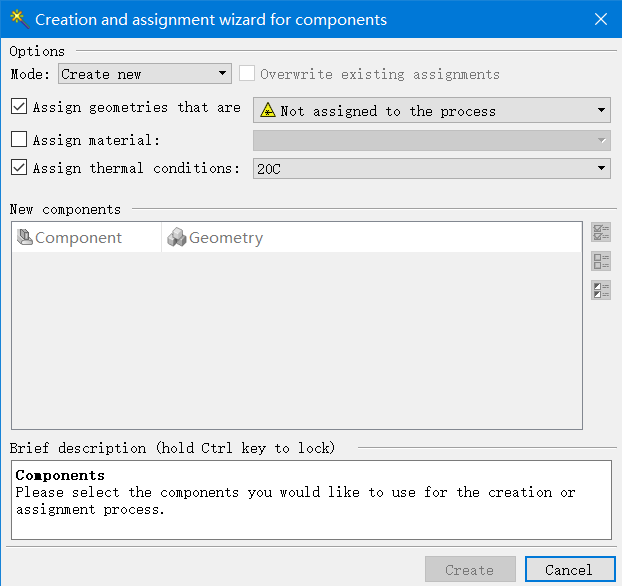 1、在左侧工艺进程树中,右键点击Process→New Componetns→Creation and assignement wizard(工艺进程→新部件→创建和指定向导)。