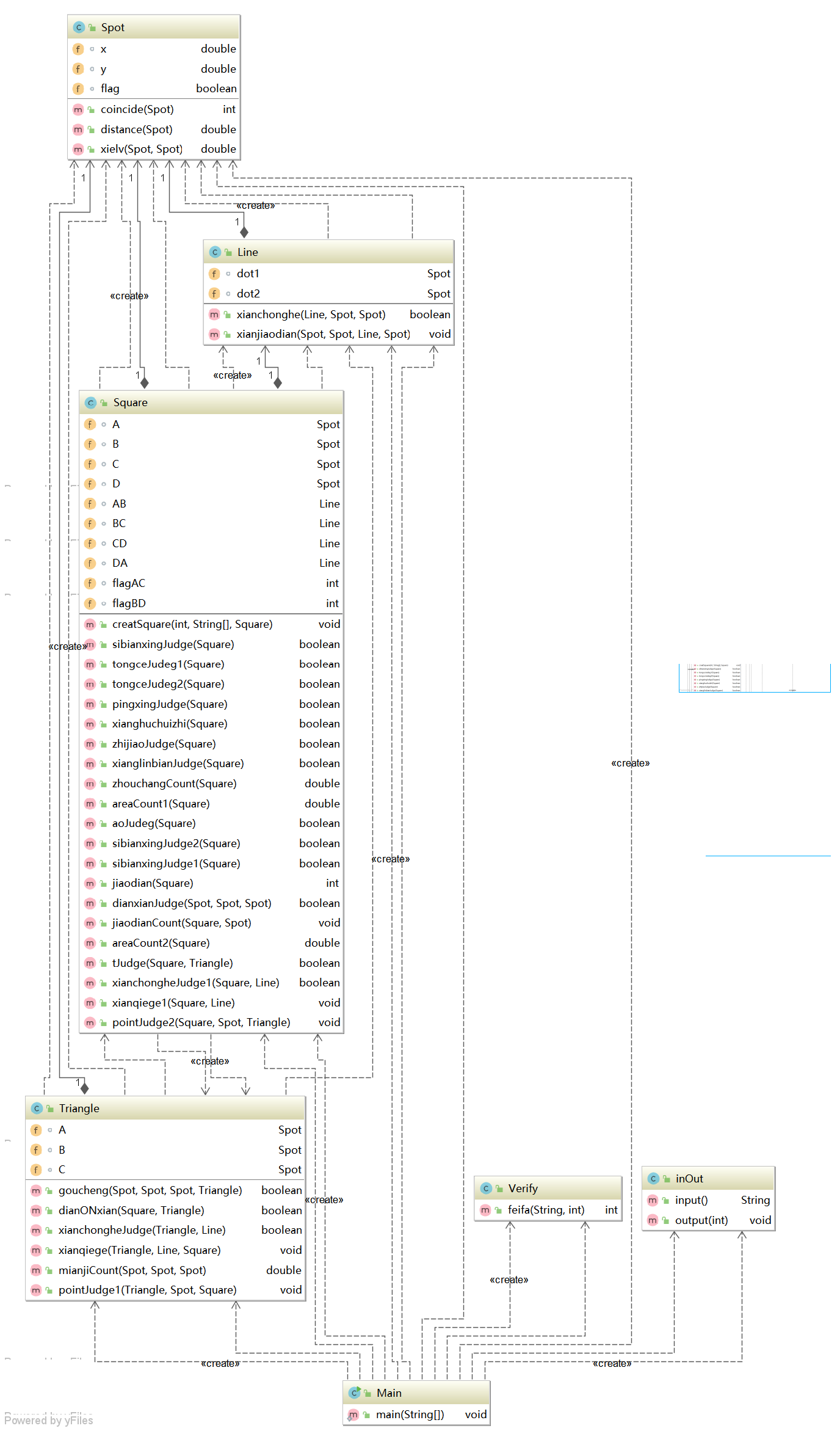 1 import java.util.Scanner; 2 3 public class Main{//主类 4 public static void main(String[] args){ 5 inOut inout = new inOut(); 6 String str = inout.input();//输入 7 int selectNum = (int)str.charAt(0) - (int)'0';//情况选择 8 int dex = 0, sign = 3;//dex为点的个数,sign应该取0,1,2以外的值 9 String[] tokens = str.split(":|,| "); 10 Verify ver = new Verify();//判非法对象 11 switch(selectNum){ 12 case 1: dex = 4; sign = ver.feifa(str,dex); 13 inout.output(sign); 14 if(sign == 1){//合法 15 Square sq = new Square(); 16 sq.creatSquare(1,tokens,sq);//四边形信息录入 17 if(sq.A.coincide(sq.B)==0 || sq.A.coincide(sq.C)==0 || sq.A.coincide(sq.D)==0 || sq.B.coincide(sq.C)==0 || sq.B.coincide(sq.D)==0 || sq.C.coincide(sq.D)==0){//有点重合 18 System.out.print("points coincide"); 19 break; 20 } 21 boolean flag = sq.sibianxingJudge(sq); 22 if(!flag){//无法构成四边形 23 System.out.print("false"+" "+"false"); 24 } 25 else{ 26 boolean flag1 = sq.pingxingJudge(sq); 27 if(flag1){//构成平行四边形 28 System.out.print("true"+" "+"true"); 29 } 30 else{//构成四边形 31 System.out.print("true"+" "+"false"); 32 } 33 } 34 } 35 break; 36 case 2: dex = 4; sign = ver.feifa(str,dex); 37 inout.output(sign); 38 if(sign == 1){//合法 39 Square sq = new Square(); 40 sq.creatSquare(1,tokens,sq);//四边形信息录入 41 /* if(sq.A.coincide(sq.B)==0 || sq.A.coincide(sq.C)==0 || sq.A.coincide(sq.D)==0 || sq.B.coincide(sq.C)==0 || sq.B.coincide(sq.D)==0 || sq.C.coincide(sq.D)==0){//有点重合 42 System.out.print("points coincide"); 43 break; 44 }*/ 45 if(!sq.sibianxingJudge(sq)){//无法构成四边形 46 System.out.print("not a quadrilateral"); 47 } 48 else{ 49 if(sq.pingxingJudge(sq) && sq.xianghuchuizhi(sq)){//平行四边形 + 对角线互相垂直 = 菱形 50 System.out.print("true"); 51 } 52 else{ 53 System.out.print("false"); 54 } 55 56 int flag = 0; 57 if(sq.pingxingJudge(sq) && sq.zhijiaoJudge(sq)){//平行四边形 + 有一个角是直角 = 矩形 58 flag = 1; 59 System.out.print(" true"); 60 } 61 else{ 62 System.out.print(" false"); 63 } 64 if(flag==0){//不是矩形,不可能是正方形 65 System.out.print(" false"); 66 } 67 else{//矩形 + 相邻边相等 = 正方形 68 if(sq.xianglinbianJudge(sq)){//相邻边相等判断 69 System.out.print(" true"); 70 } 71 else{ 72 System.out.print(" false"); 73 } 74 } 75 } 76 } 77 break; 78 case 3: dex = 4; sign = ver.feifa(str,dex); 79 inout.output(sign); 80 if(sign == 1){//合法 81 Square sq = new Square(); 82 sq.creatSquare(1,tokens,sq);//四边形信息录入 83 if(sq.A.coincide(sq.B)==0 || sq.A.coincide(sq.C)==0 || sq.A.coincide(sq.D)==0 || sq.B.coincide(sq.C)==0 || sq.B.coincide(sq.D)==0 || sq.C.coincide(sq.D)==0){//有点重合 84 System.out.print("points coincide"); 85 break; 86 } 87 88 if(sq.sibianxingJudge(sq)){//构成凸四边形 89 if(sq.aoJudeg(sq)){ 90 System.out.print("false"); 91 double zhouchang = sq.zhouchangCount(sq);//周长计算 92 double area = sq.areaCount2(sq);//面积计算 93 zhouchang = Math.round(zhouchang*1000)/1000.0; 94 area = Math.round(area*1000)/1000.0; 95 System.out.print(" "+zhouchang+" "+area); 96 } 97 else{ 98 System.out.print("true"); 99 double zhouchang = sq.zhouchangCount(sq);//周长计算 100 double area = sq.areaCount1(sq);//面积计算 101 zhouchang = Math.round(zhouchang*1000)/1000.0; 102 area = Math.round(area*1000)/1000.0; 103 System.out.print(" "+zhouchang+" "+area); 104 } 105 } 106 else if(sq.sibianxingJudge1(sq)){//构成凹四边形 107 System.out.print("false"); 108 double zhouchang = sq.zhouchangCount(sq);//周长计算 109 double area = sq.areaCount2(sq);//面积计算 110 zhouchang = Math.round(zhouchang*1000)/1000.0; 111 area = Math.round(area*1000)/1000.0; 112 System.out.print(" "+zhouchang+" "+area); 113 } 114 else{ 115 System.out.print("not a quadrilateral"); 116 } 117 118 /* 119 if(!sq.sibianJudge(sq)){ 120 System.out.print("not a quadrilateral"); 121 } 122 else{ 123 int flag = sq.aotuJudge(sq); 124 if(flag == 1){ 125 System.out.print("true"); 126 double zhouchang = sq.zhouchangCount(sq);//周长计算 127 double area = sq.areaCount1(sq);//面积计算 128 zhouchang = Math.round(zhouchang*1000)/1000.0; 129 area = Math.round(area*1000)/1000.0; 130 System.out.print(" "+zhouchang+" "+area); 131 } 132 else if(flag == 2){ 133 System.out.print("false"); 134 double zhouchang = sq.zhouchangCount(sq);//周长计算 135 double area = sq.areaCount2(sq);//面积计算 136 zhouchang = Math.round(zhouchang*1000)/1000.0; 137 area = Math.round(area*1000)/1000.0; 138 System.out.print(" "+zhouchang+" "+area); 139 } 140 else{ 141 System.out.print("not a quadrilateral"); 142 } 143 }*/ 144 } 145 break; 146 case 4: dex = 6; sign = ver.feifa(str,dex); 147 inout.output(sign); 148 if(sign == 1){//合法 149 Line l = new Line(); 150 Square sq = new Square(); 151 l.dot1.x = Double.valueOf(tokens[1]); l.dot1.y = Double.valueOf(tokens[2]); 152 l.dot2.x = Double.valueOf(tokens[3]); l.dot2.y = Double.valueOf(tokens[4]); 153 if(l.dot1.coincide(l.dot2) == 0){//两点重合 154 System.out.print("points coincide"); 155 break; 156 } 157 sq.creatSquare(5, tokens, sq);//四边形信息录入 158 Triangle t = new Triangle(); 159 if(sq.tJudge(sq,t)){//构成三角形 160 if(t.xianchongheJudge(t, l)){//线重合边 161 System.out.print("The line is coincide with one of the lines"); 162 break; 163 } 164 t.xianqiege(t, l, sq);//直线切割三角形 165 } 166 else if(sq.sibianxingJudge2(sq)){//构成凸四边形 167 if(sq.xianchongheJudge1(sq, l)){//线重合边 168 System.out.print("The line is coincide with one of the lines"); 169 break; 170 } 171 sq.xianqiege1(sq, l);//直线切割四边形 172 } 173 else{ 174 System.out.print("not a quadrilateral or triangle"); 175 } 176 } 177 break; 178 case 5: dex = 5; sign = ver.feifa(str,dex); 179 inout.output(sign); 180 if(sign == 1){//合法 181 Spot dot = new Spot(); 182 dot.x = Double.valueOf(tokens[1]); dot.y = Double.valueOf(tokens[2]); 183 Triangle t 