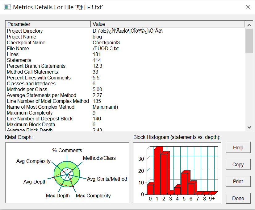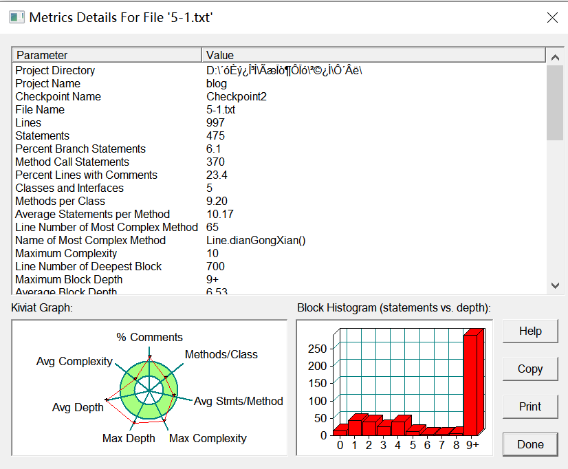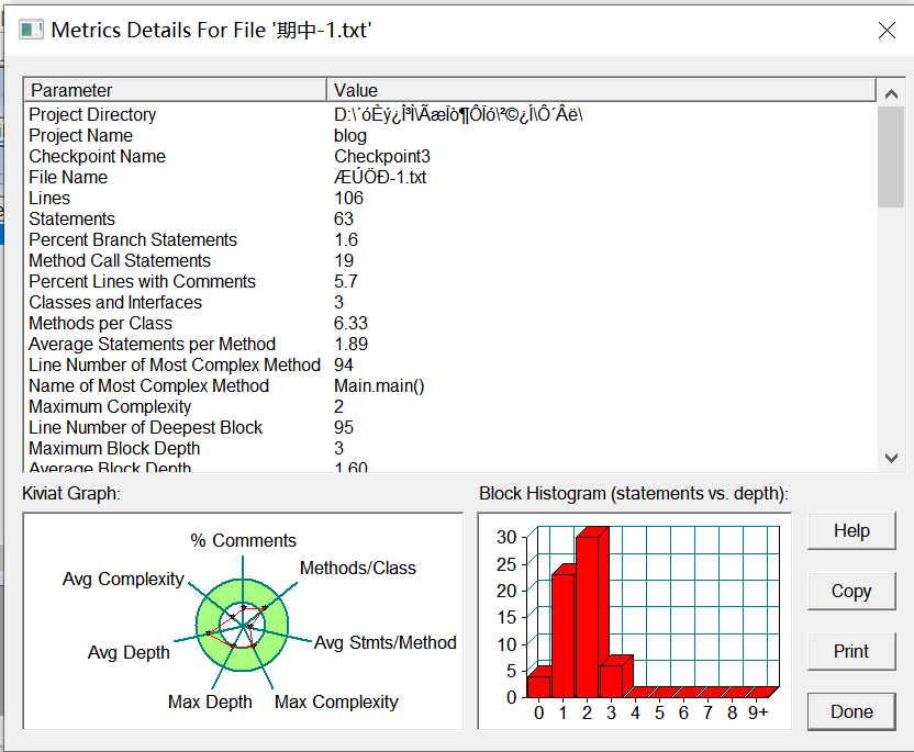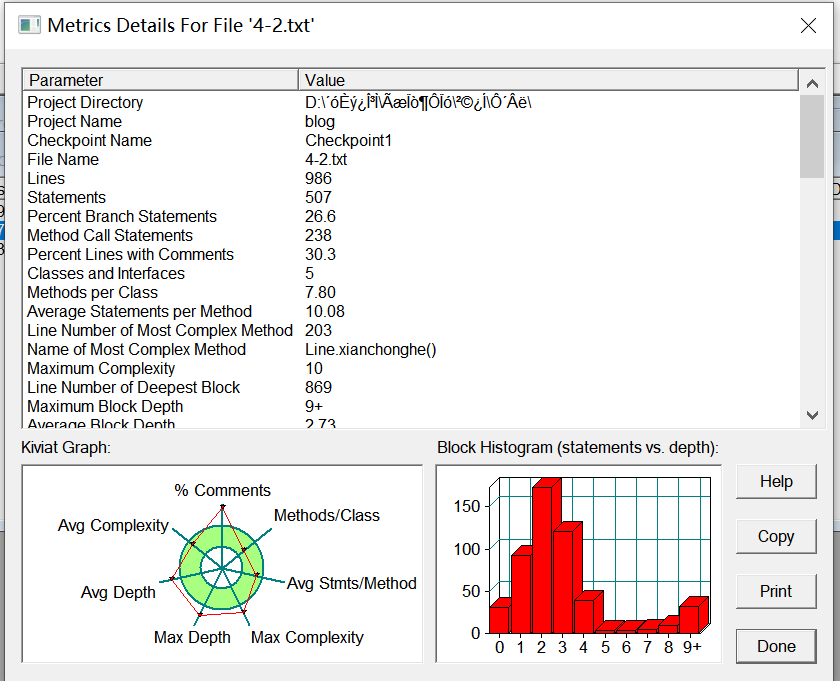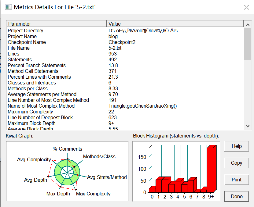 分析:类和方法的设置适中,深度和复杂度越界,感觉是因为算法的设计出现了漏洞然后不好修改只能填补或重写供后面使用,以及对于类的用法并不是很熟练,并未用上父类、子类、继承等这些可以让代码更加简洁的办法。