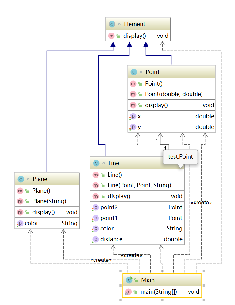 element = p1;//起点Point element.display(); element = p2;//终点Point element.display(); element = line;//线段 element.display(); element = plane;//面 element.display();类结构如下图所示。