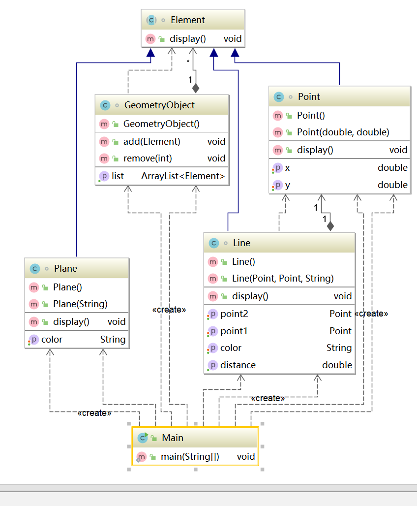 GeometryObject:容器类,包含一个私有的数组属性,数组类型为Element类,一个空的构造方法,添加对象方法,删除对象方法;