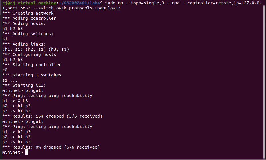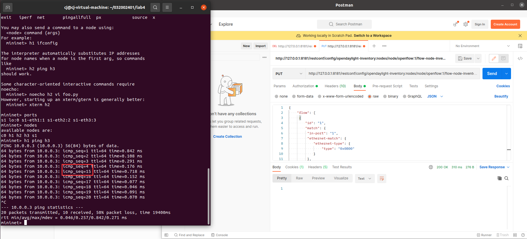 - 通过Postman工具调用OpenDaylight提供的API下发流表,实现拓扑内主机h1和h3网络中断10s