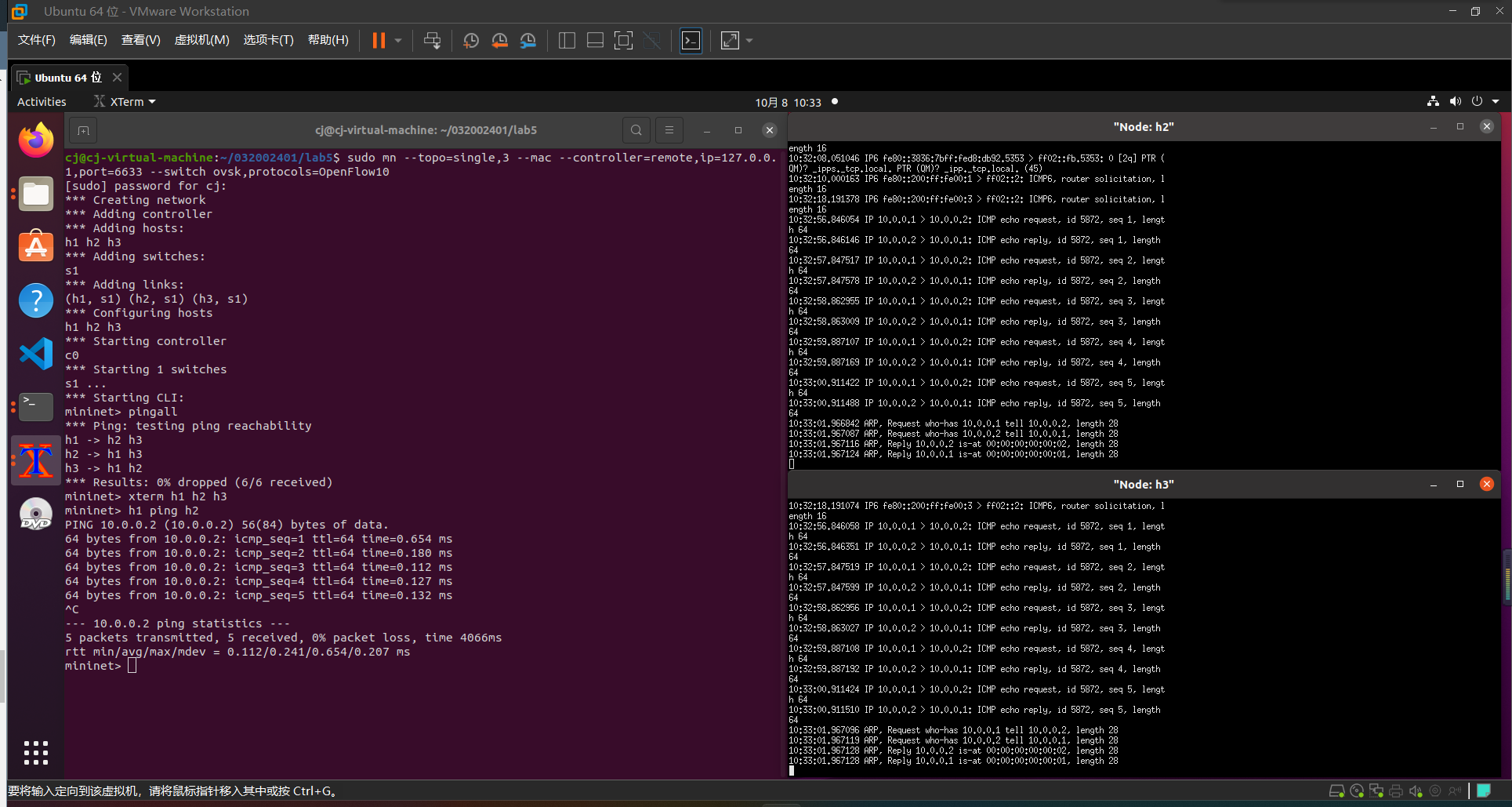 本次实验接触和学习了POX控制器,初步了解了其中的一些基础操作和阅读理解了其中一些模块的代码,并成功总结出流程图。在验证Hub/Switch模块的过程中,不仅帮助我理解了POX控制器的工作原理,而且让我对于流表下发、交换机工作原理等知识更加熟悉。