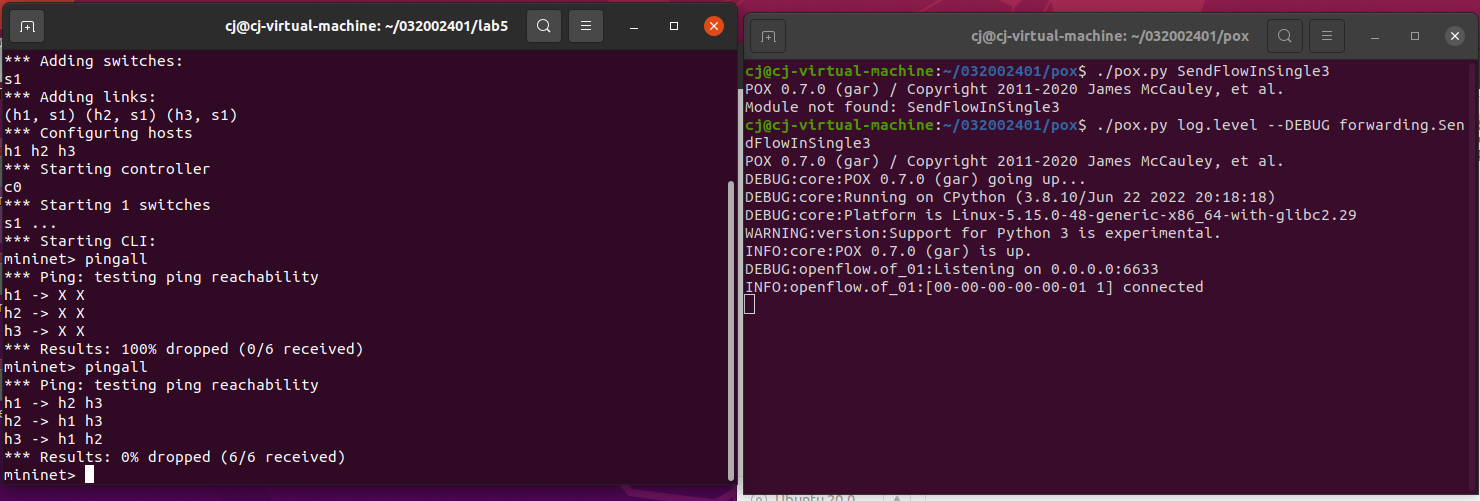 - 重新搭建(一)的拓扑,此时交换机内无流表规则,拓扑内主机互不相通;编写Python程序自定义一个POX模块SendFlowInSingle3,并且将拓扑连接至SendFlowInSingle3(默认端口6633),实现向s1发送流表规则使得所有主机两两互通。