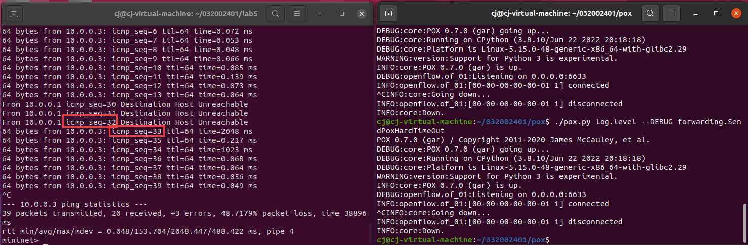 在实验指导书中进阶要求二部分展示了调用硬超时模块时的两种结果,因为一开始我跑出的都是同一种结果(出现数据包Unreachable),,,百思不得其解,最后才发现要凭运气和手速,绝啦!